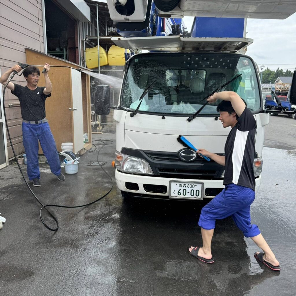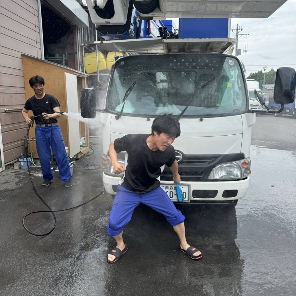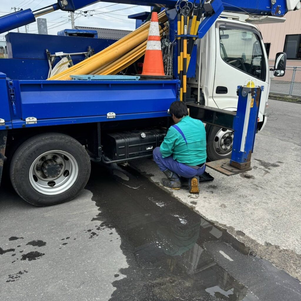 社内で安全対話を終えると、配電マンたちは毎月1回、相棒である高所作業車の「点検・メンテナンス・清掃」を行います(その様子は、まるで愛馬を丁寧に手入れしているようで…見ているとちょっとほっこりします♡)